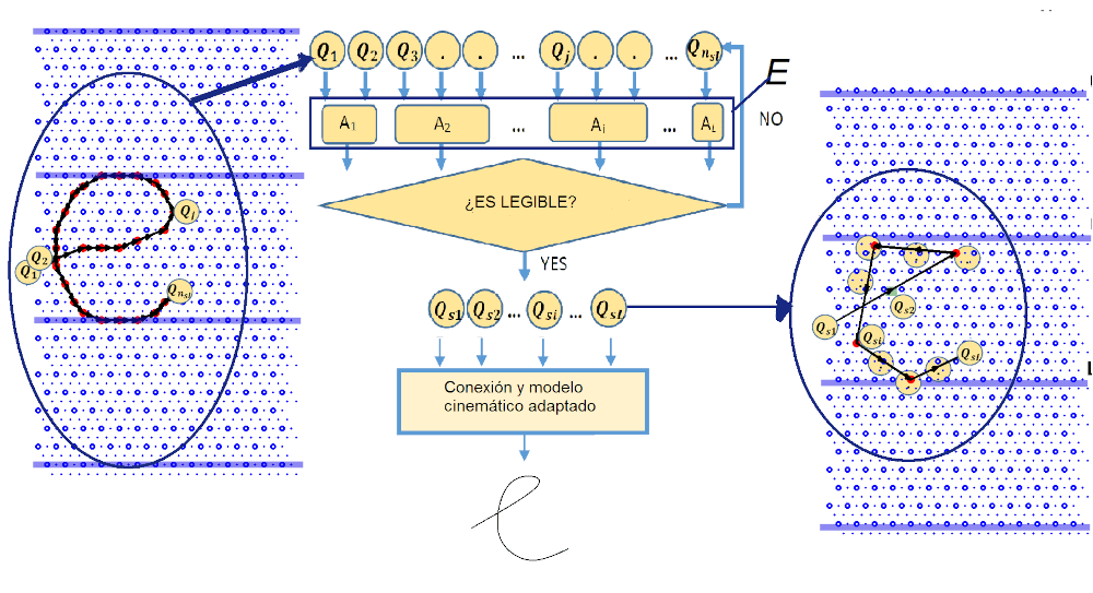 - Etapa 1: consiste en seleccionar la trayectoria de cada letra partiendo de una trayectoria previamente almacenada. Este proceso se realiza una única vez cuando se programa el tipo de escritura u idioma que se va a aprender.